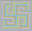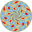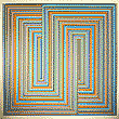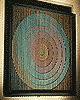 [Click to view] Printed paper on hardboard, cotton strings, 50 x 120 cm Stripes on the twelve groups of concentric squares are arranged in a permutation so that no two are alike. The colours change as the viewer moves past. |